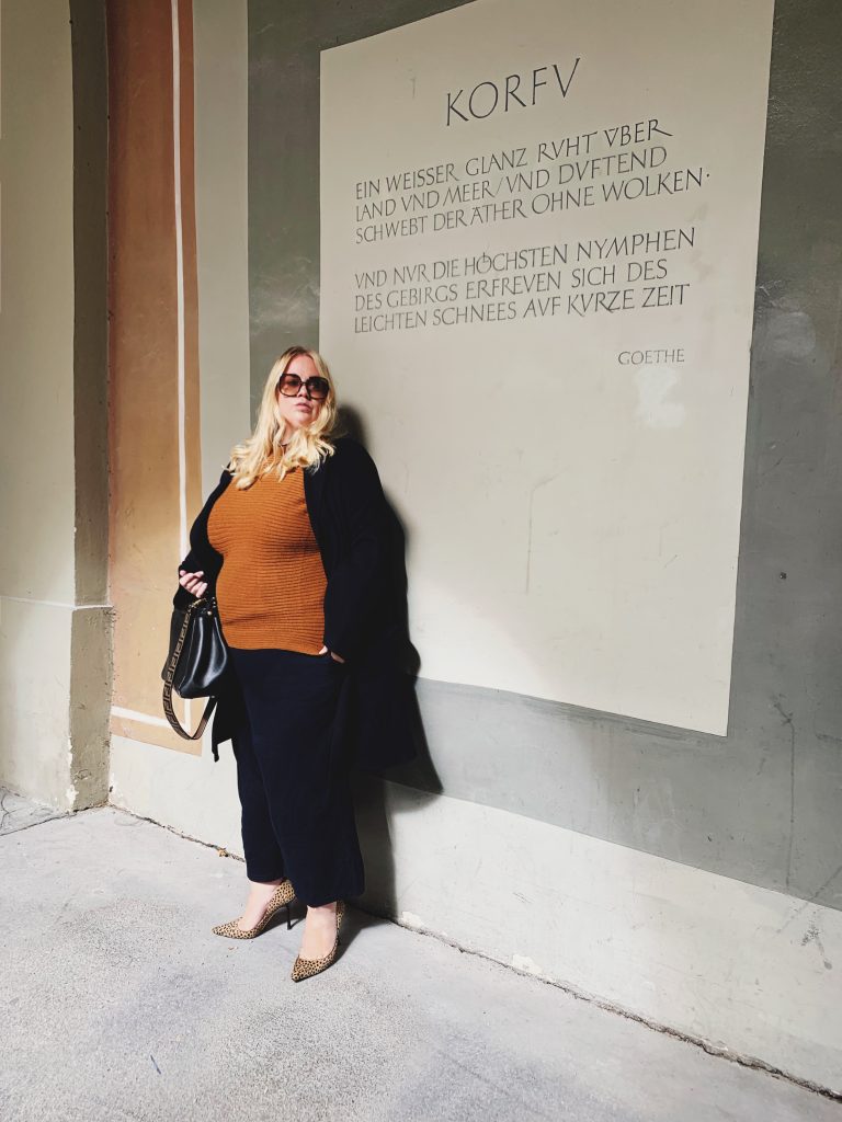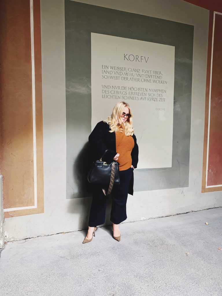 What I wear: MR Woll Mantel in dunkelblau / Jimmy Choo Leopard Pumps / Fendi Peek-a-boo medium in schwarz / Dior “So Stellaire 1” Sonnenbrille / Only Pullover via ASOS Curve/ Annalisa Pants via Navabi.