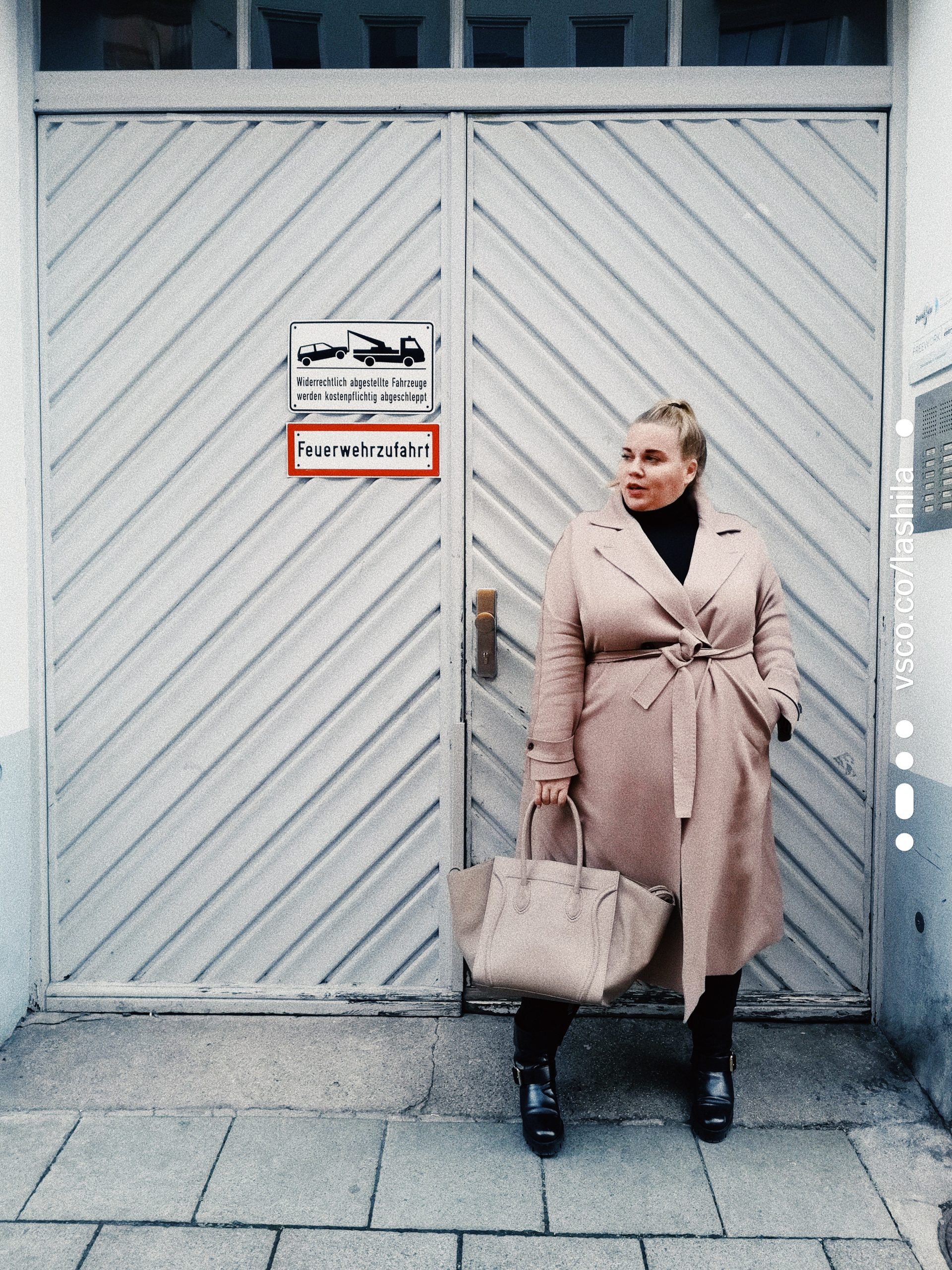 I’m wearing a Marina Rinaldi Trench which is the perfect companion for a classy business day. The combination of a black wool-turtleneck and black skinny pants gives you the chance to bring a little spring into grey February.